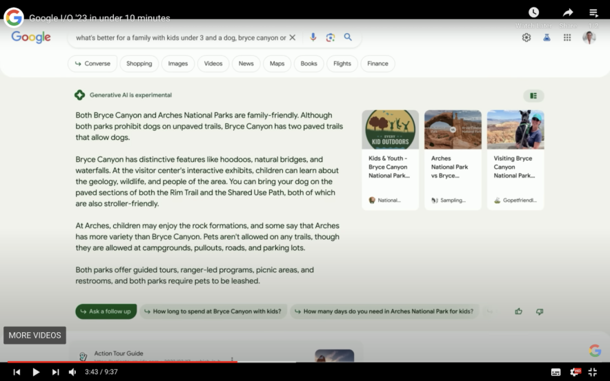 At their Google I/O 2023 event , Google announced some exciting new AI technological advances that will be added to their products. Among the most notable of these is the Search Generative Experience, also known as SGE.